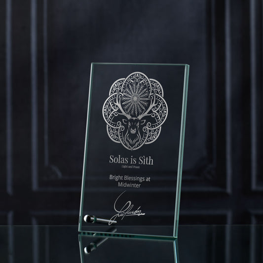 The Midwinter Stag – Solas is Sìth Glass Plaque, A Hand-Engraved Symbol of Light and Peace