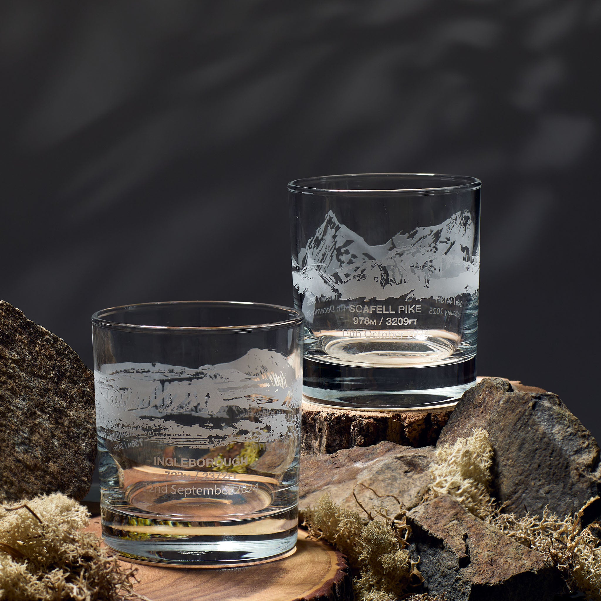 Celebrate the achievement of a lifetime with a glass that brings Britain’s most iconic peaks together in one continuous, wraparound engraving. From Ben Nevis in the Highlands, through Scafell Pike in the Lake District, to Yr Wyddfa (Snowdon) in Wales, this unique design combines the Three Peaks into a single striking mountain range.