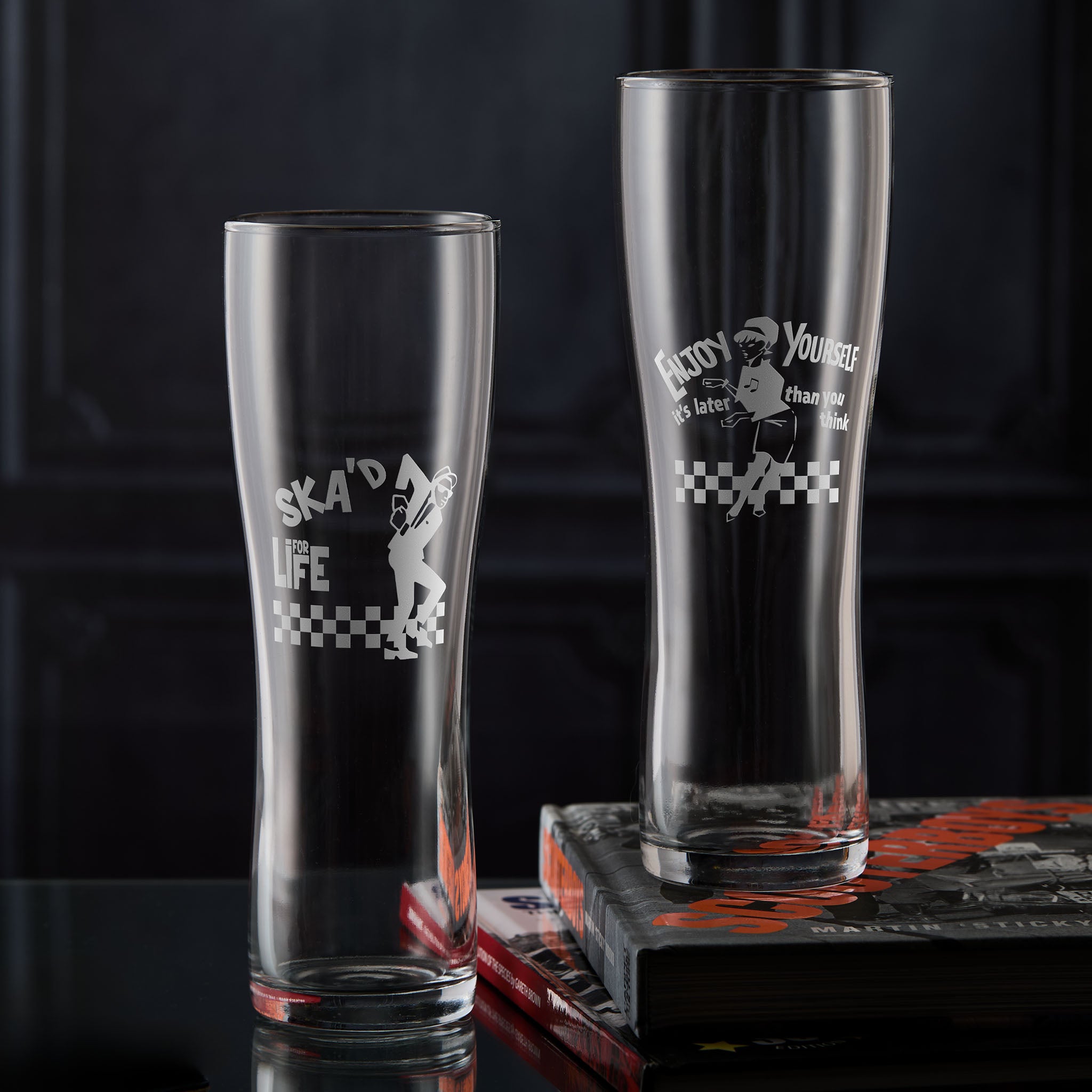 He’s the silhouette that started it all. Inspired by a photo of and reborn as Walt Jabsco, this iconic figure came to represent more than a record label — he became the face of a movement. This engraved pint glass captures him mid-ska, stepping out in sharp monochrome style on a checkerboard floor, surrounded by the words “Enjoy Yourself"”